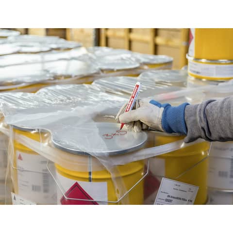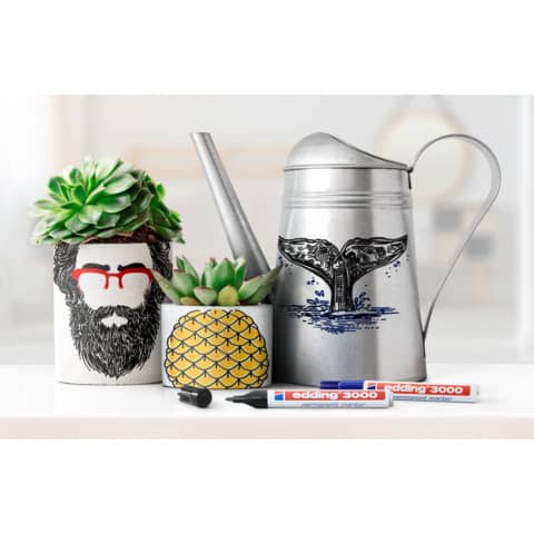 Permanentmarker zum Markieren und Beschriften fast aller Materialien, z. B. Papier, Karton, Metall, Kunststoff und Glas. Die Rundspitze verfügt über eine Strichbreite von 1,5-3 mm. Wasserfest und abriebbeständig auf fast allen Oberflächen. Passende Ersatzspitzen (edding 3000 Ersatzspitzen) sind erhältlich. Die Tinte ist geruchsarm und ohne Zusatz von Toluol/Xylol. Hochwertiger Aluminiumschaft.