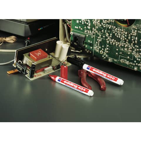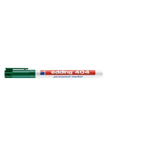 Permanentmarker edding 404. Nachfüllbarer Marker zum Beschriften, Bemalen, Kennzeichnen von fast allen Materialien, auch Metall, Glas, Kunststoff. Permanente, geruchsarme Tusche ohne Zusatz von Toluol/Xylol, wisch- und wasserfest, lichtbeständig. Austauschbare Rundspitze. Kunststoffschaft. Umsteckbare Kappe in Schreibfarbe. Schaftfarbe: weiß. Strichstärke: ca. 0,75 mm. Schreibfarbe: grün.