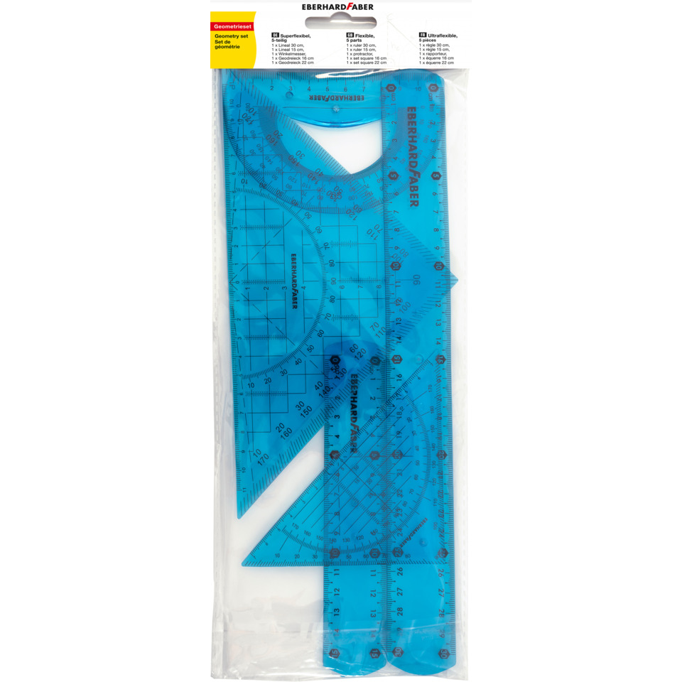 Lineal (Büro, Schule) Geometrieset 5-teilig flexibel, Werkstoff: Kunststoff. Ausstattung Lineal:, Ausführung der Tuschekante: oberseitig, mm-Facette farbig unterlegt. Größe (L x B): 37,3 cm. 143 mm. Farbe: blau. Ausführung des Inhalts mit Packung: 1 Lineal 30 cm, 1 Lineal 15 cm, 1 Geodreieck 22 cm, 1 Winkelmesser; 1 kleinem Geodreieck
