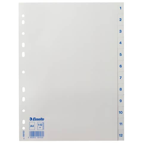 Esselte Plastikregister Economy 1-12, A4, mit Universallochung. Material: Polypropylen (PP). Blattanzahl 12. Format: 225 x 297 mm. Farbe: weiss.
