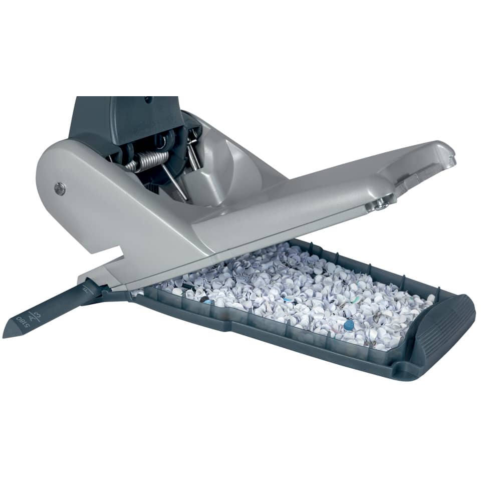 Leitz Extrastarker Registraturlocher mit Anschlagschiene aus Kunststoff, auch für A3. Arretierbarer Hebel zur platzsparenden Aufbewahrung. Stanzleistung/Blatt: 6,5 mm/65. Material: Aluminium-Druckguss mit Kunststoffboden. 10 Jahre Garantie, GS-geprüft. Farbe: silber.