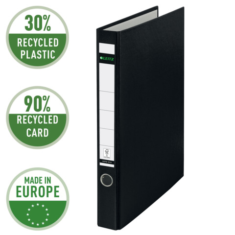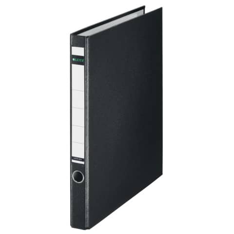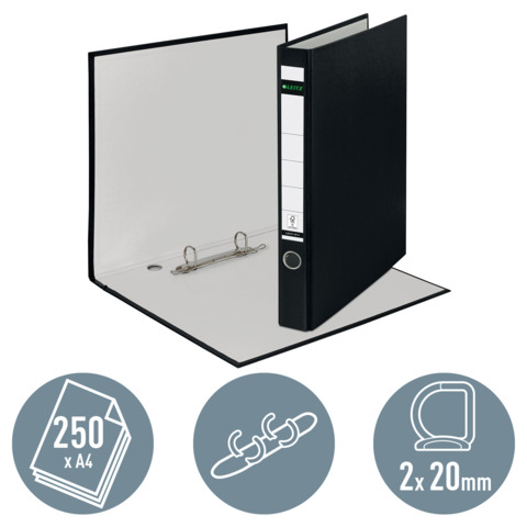 Leitz Ringordner, ohne Schlitze. Mechanik: 2-Ring-Reißmechanik, und Blattniederhalter. Ringdurchmesser: 20 mm, Füllhöhe: 15 mm, Rückenbreite: 35 mm. Material: Einband aus Pappe (RC), außen mit Polypropylen kaschiert, innen hellgraues PE-beschichtetes Papier. Format: 318 x 285 mm, für A4. Farbe: schwarz.