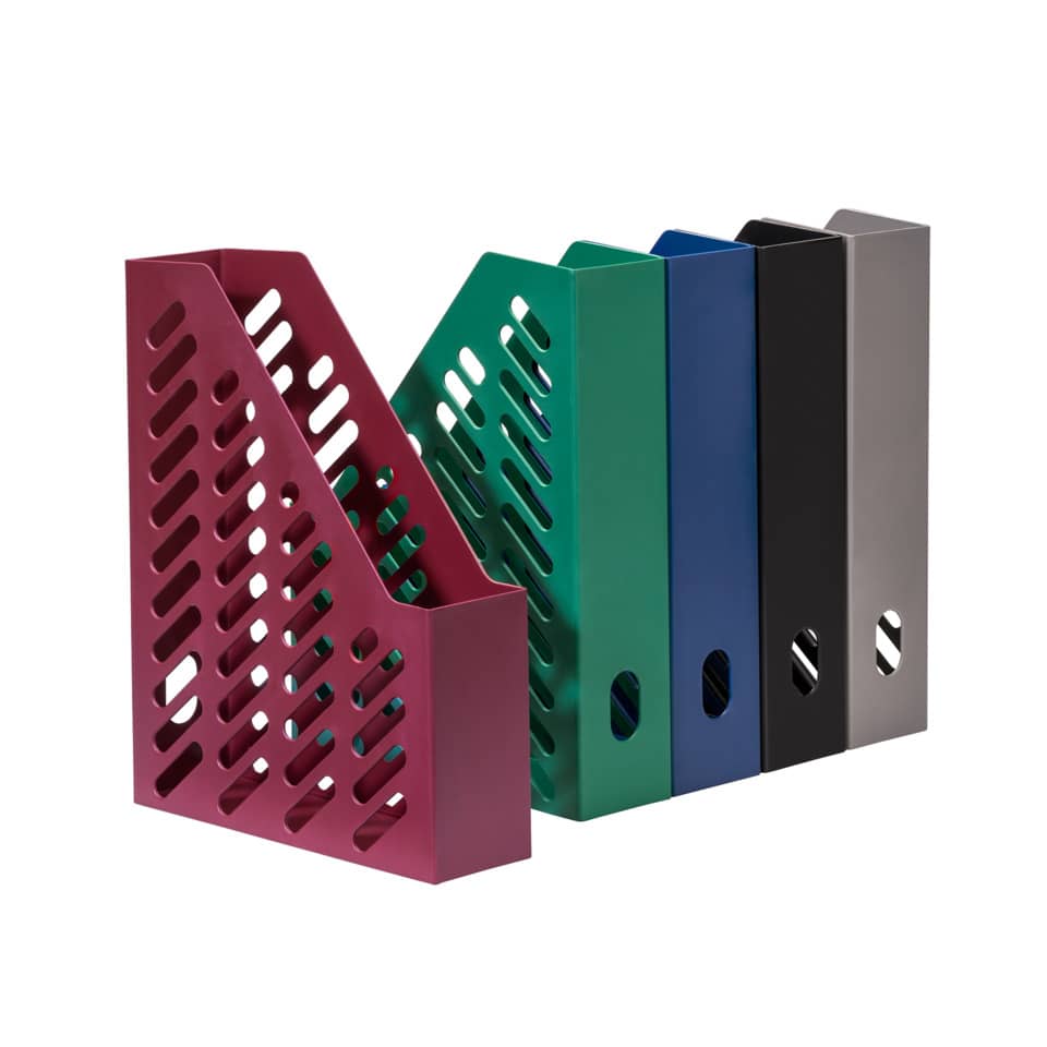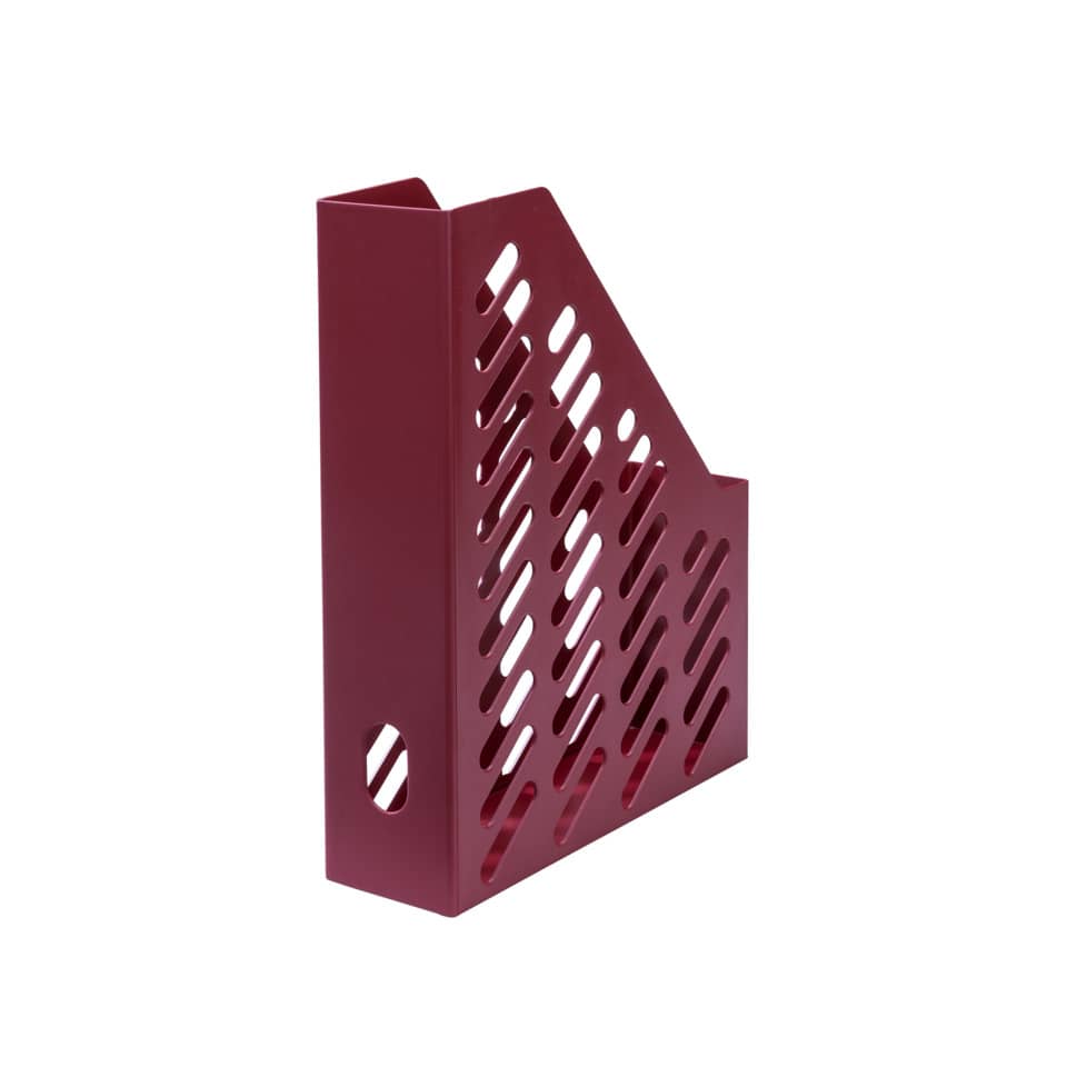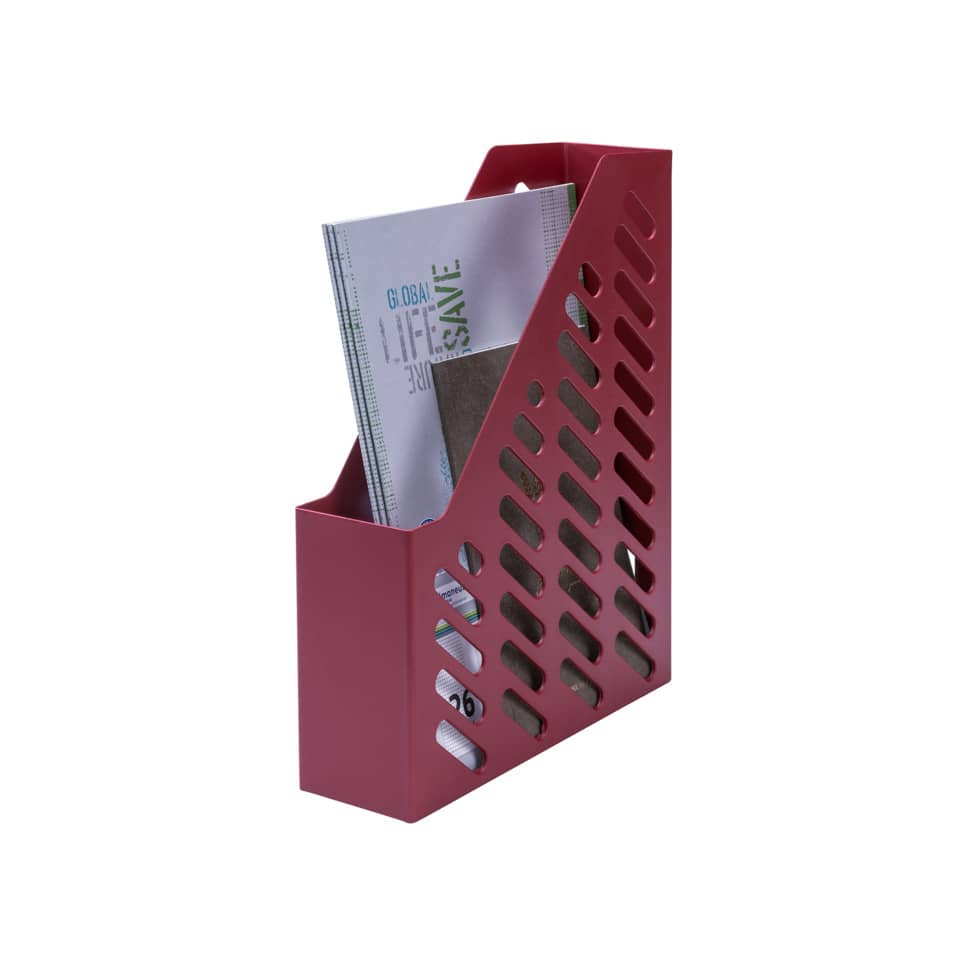 Stehsammler KLASSIK KARMA bis DIN A4/C4. Der umweltfreundliche Stehsammler. Nichts kippt mehr, nichts liegt herum, alles ist schön sortiert. Für das HAN KARMA-Programm werden Post Consumer Materialien (bereits benutzte Kunststoffprodukte) verarbeitet. Extra hohe Vorderseite um Dokumente sicher zu halten. Mit seitlichem Raster, das Einsicht auf Kataloge, Prospekte, Zeitschriften, etc. erlaubt. Mit praktischem Griffloch im Rückenteil für eine schnelle Entnahme. Zur Aufbewahrung von Unterlagen bis DIN A4/C4 geeignet. Fassungsvermögen: 70 mm. Made in Germany. Außenmaße (B x T x H): 76 x 246 x 315 mm. Höhe vorne: 148 mm. Material: 80-100% Recyclingmaterial. Farbe: öko-rot.