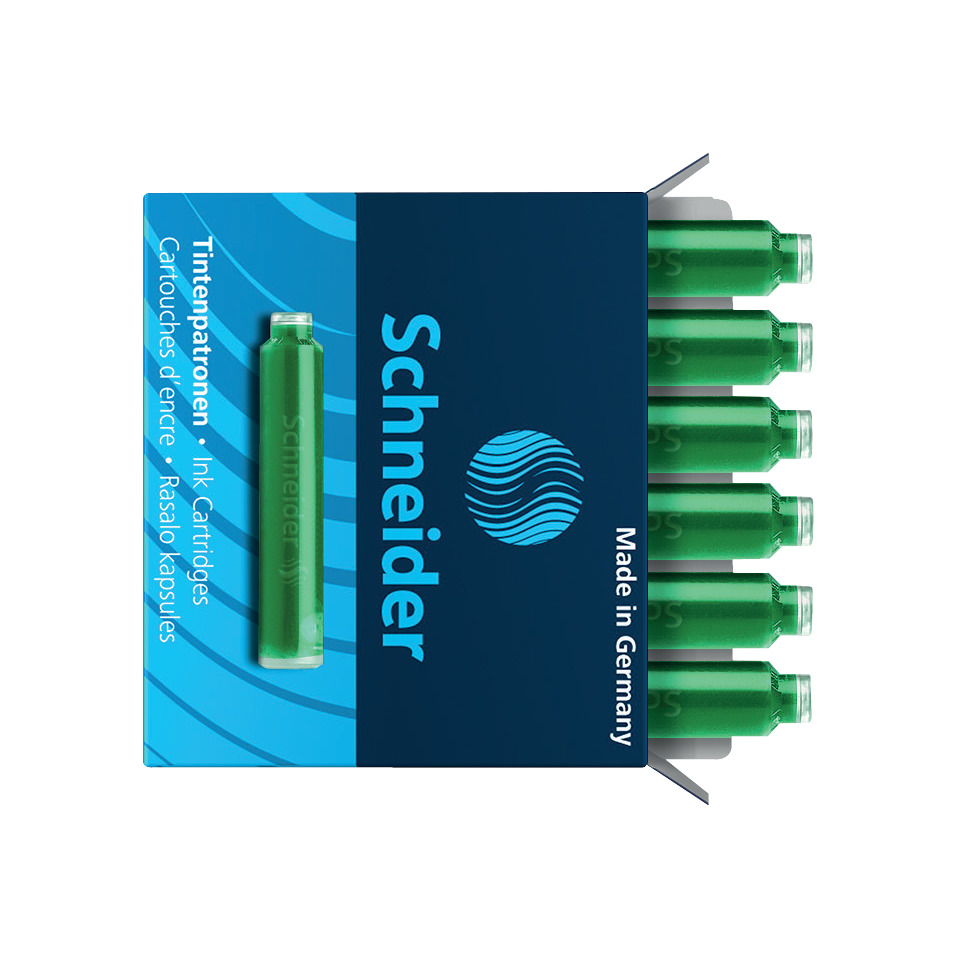 Tintenpatrone Standard für Füllhalter. Verwendung für Produkt: passend in Schneider und viele andere Füllhalter und Patronenroller. Typbezeichnung der Tintenpatrone: Standard-Format. Mit Kugelverschluss. Farbe: grün. Ausführung des Inhalts mit Packung: 6er Schachtel.