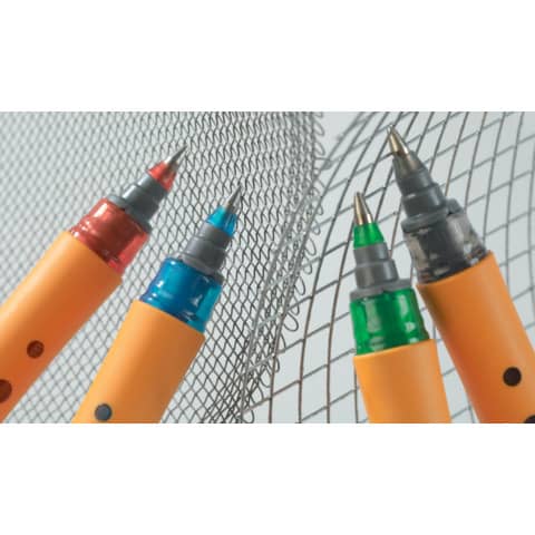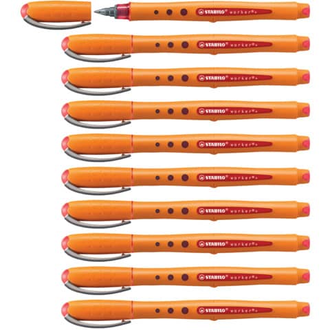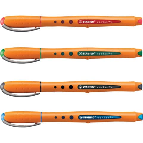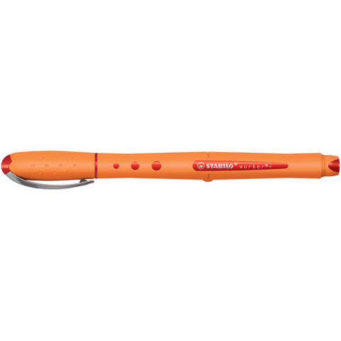 Tintenroller STABILO® worker®+ fine, Kappenmodell, Typbezeichnung der Mine: Rollerballmine, Art der Schreibflüssigkeit: Tinte auf Wasserbasis, Ausführung Mine: unverwüstliche Edelstahlspitze gleitet rasant über das Papier, 0,3 mm, rot, kann einige Tage offen liegen bleiben, ohne einzutrocknen, Tintenspeicher-Technik: Free Ink System, Ausführung Stift: Polypropylen, rutschfeste Oberfläche auf dem gesamten Schaft, Material des Clips: Metall, für ein sanftes Schreibgefühl. Tintenstand-Kontrolle. Kappe am Stiftende aufsteckbar, Farbe des Schaftes: orange.