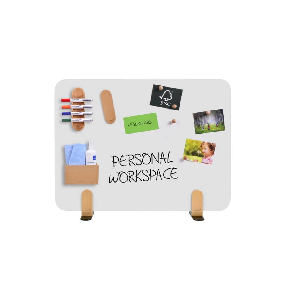 Hochwertige, rahmenlose Tischtrennwand doppelseitig als magnethaftendes Whiteboard verwendbar. Tafel-Abmessungen: 60 x 80 x 1,1cm. Magnetische Whiteboard-Oberfläche aus emailliertem Stahl. Beschreibbar mit trocken abwischbaren Whiteboardmarkern. Kratzfestes Whiteboard für langfristige Nutzung. Set mit 2 Halterungen aus Holz enthalten für die freistehende Montage der Trennwand auf einem Schreibtisch. Halterung ist nur zur Montage der horizontalen Ausführung von ELEMENTS Trennwänden geeignet. Holz ist ein Naturprodukt. Jede Halterung, hergestellt aus lackiertem Buchenholz (Fagus sylvatica), ist einzigartig in Farbe und Aussehen. Dieses Produkt besteht aus Materialien aus nachhaltig bewirtschafteten, FSC®-zertifizierten Wäldern sowie anderen kontrollierten Quellen (FSC C158462). Einfache Montage mit enthaltenem Inbusschlüssel.