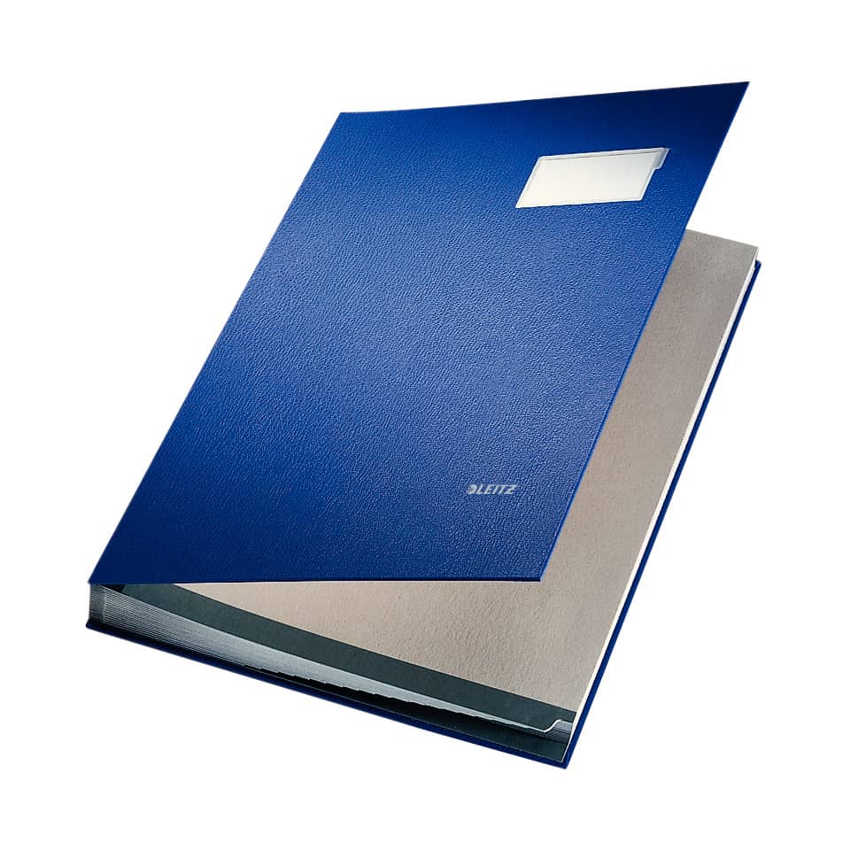 Leitz Unterschriftsmappe, 20 Fächer, mit 3 Sichtlöchern und verstärkten Wendetaben. Hohes Füllvermögen durch dehnbaren Rücken, der durch einen speziellen Kunststoffüberzug vor dem Einreissen geschützt ist. Mit aufklappbarem Fenster zum Austauschen des Beschriftungsschildes. Material: Einband aus PP-kaschierter Graupappe (RC), Fächerblock aus grauem Löschkarton (RC). Format: 240 x 340 mm, A4. Farbe: blau.