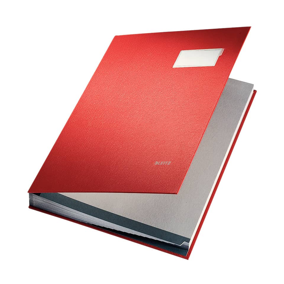 Leitz Unterschriftsmappe, 20 Fächer, mit 3 Sichtlöchern und verstärkten Wendetaben. Hohes Füllvermögen durch dehnbaren Rücken, der durch einen speziellen Kunststoffüberzug vor dem Einreissen geschützt ist. Mit aufklappbarem Fenster zum Austauschen des Beschriftungsschildes. Material: Einband aus PP-kaschierter Graupappe (RC), Fächerblock aus grauem Löschkarton (RC). Format: 240 x 340 mm, A4. Farbe: rot.