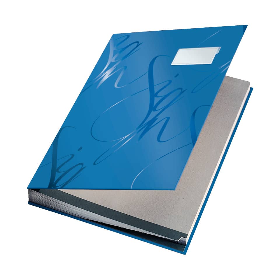 Leitz Unterschriftsmappe Design, 18 Fächer, mit 3 Sichtlöchern, hohes Füllvermögen durch dehnbaren Rücken, Fenster mit auswechselbarem Beschriftungsschild, mit elegantem Schriftzug auf dem Einband und seidenmatt laminierter Oberfläche für angenehme Haptik und Schutz vor Wasser und Schmutz. Material: Einband aus laminerter Graupappe (RC), Fächerblock aus grauem Löschkarton (RC). Format: 240 x 340 mm, A4. Farbe: blau.