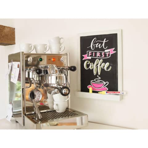 Kreidemarker für die nicht-permanente Gestaltung, Dekoration und Beschriftung von geschlossenen Oberflächen, z. B. Fenster, dunkle Tafeln, Glas, plexiglas® und Spiegel. Die Rundspitze verfügt über eine Strichbreite von 2-3 mm. Die deckende, geruchsneutrale Flüssigkreide auf Wasserbasis kann von fast allen geschlossenen Oberflächen mit einem feuchten Tuch abgewischt werden.