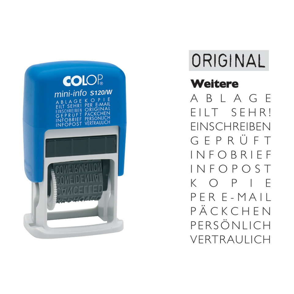 Mini-Wortbandstempel S 120/W: Die 12 im Büro gebräuchlichsten Texte mit einfachem Mechanismus zum Umstellen. Standardmäßig mit schwarzem Farbkissen. Texte: KOPIE, PER E-MAIL, ORIGINAL, PÄCKCHEN, PERSÖNLICH, VERTRAULICH, ABLAGE, EILT SEHR, EINSCHREIBEN, GEPRÜFT, INFOBRIEF, INFOPOST.
